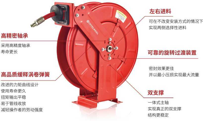 INTELREEL設(shè)計師團隊長期從事卷繞產(chǎn)品與技術(shù)研究,著眼客戶實際需求,勇于自我否定,并在持續(xù)跟蹤用戶產(chǎn)品體驗的過程中積累了豐厚的專業(yè)經(jīng)驗,因此我們的卷盤產(chǎn)品也在經(jīng)歷著不斷改進與蛻變。享有發(fā)明專利的旋轉(zhuǎn)結(jié)構(gòu)組件,高品質(zhì)緩釋渦卷彈簧,雙支撐穩(wěn)定結(jié)構(gòu),兩側(cè)選擇性流體接入構(gòu)造,以及快速鎖定裝置等超凡的設(shè)計,所有的這些特征共同造就了非凡的+NTELREEL卷盤產(chǎn)品。